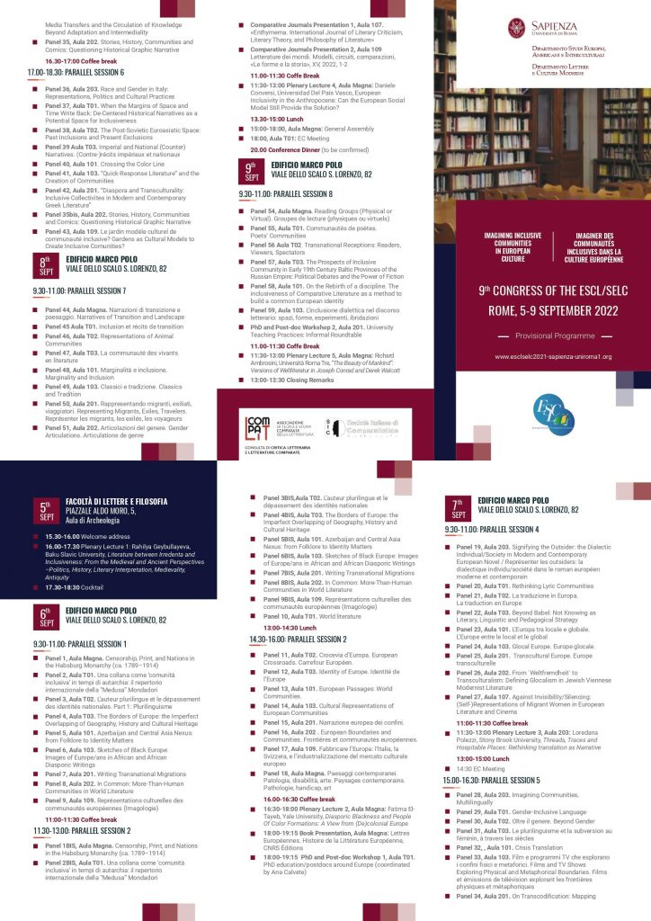 The 9th Congress of the European Society of Comparative Literature took place in Rome 5-9 September 2022 under the title Imagining inclusive communities in European culture / Imaginer des communautés inclusives dans la culture européenne / Immaginare comunità inclusive nella cultura europea
